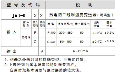 JWB 热电阻二线制温度变送器。用于Pt100 或 Cu50输入,经隔离变送输出标准的直流电流信号4~20mA 。二线制方式(回路供电电源与信号输出为共同的二根导线),输出电流与被测温度成线性,精度 0.2%。一体化结构安装于温度传感器的标准接线盒内,产品通过CE认证。