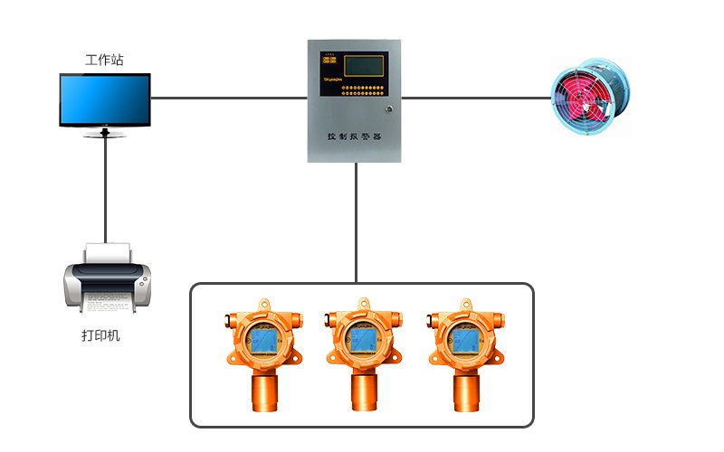 单独固定的有害气体检测报警:传感器和信号传输电路组装在防爆外壳中,通常称为探头,安装在现场(危险的地方);第二部分包括数据处理、二次显示、报警控制和电源,组装成控制器,通常称为二级仪表,安装在控制室(安全场所)。探头扩散采样检测,二次仪表显示报警。