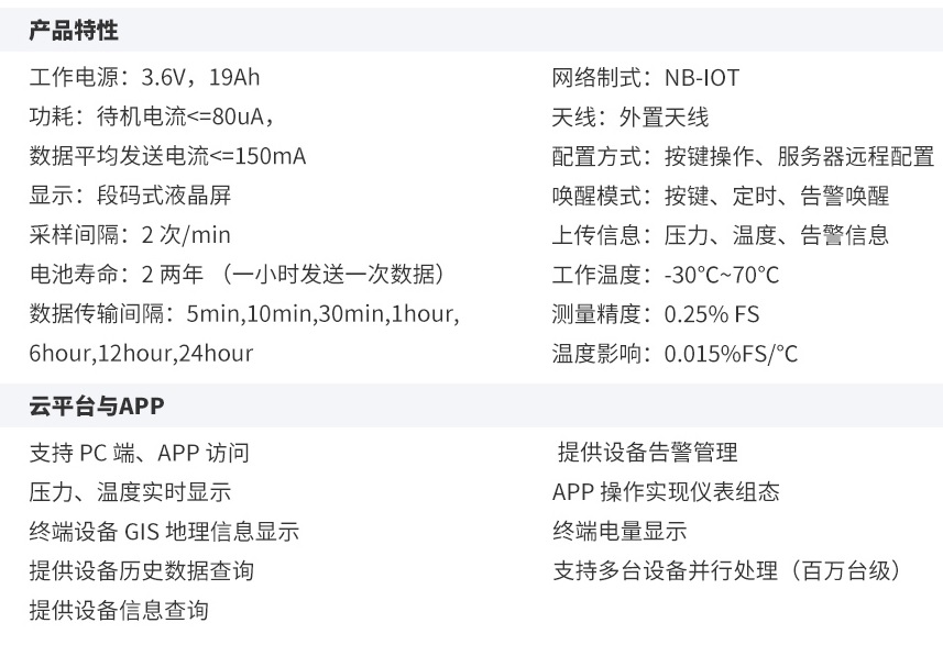 NB-IOT压力温度监测终端是一款基于窄带物联网NBIOT(Narrow BandInternet of Things) 网络的物联网产品,NB(Narrow Band)无线传输方案在功耗控制、信号可靠性方面比GPRS有显著优势,结合自主设计运行的大数据云平台,为用户提供关于压力、温度测量的物联网解决方案和数据服务。