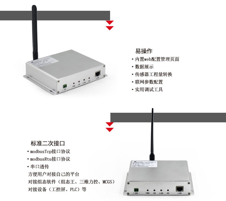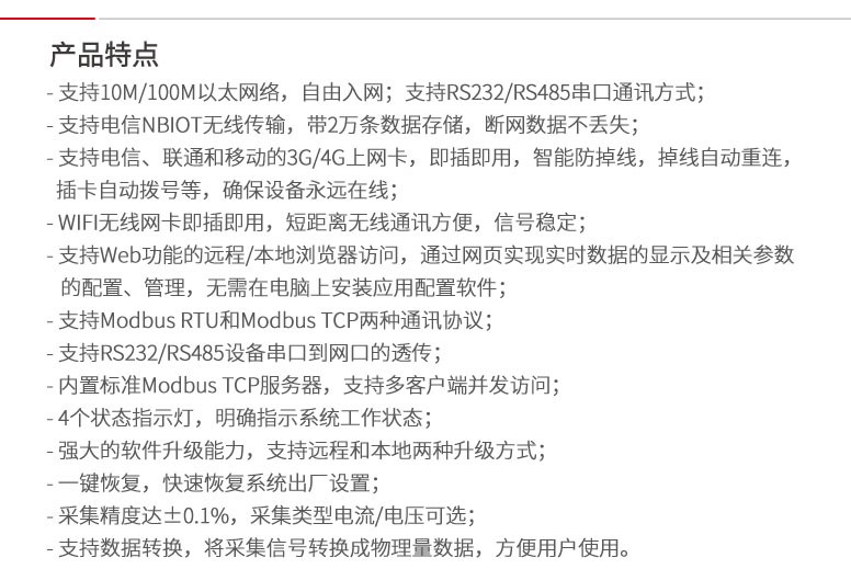 NB-1200物联网网关是一款集模拟量采集、开关量采集、继电器输出控制的网关产品。它提供了标准的10/100M以太网接口,3G/4G/WIFI/NBIOT无线接口,RS232或RS484通讯接口,可将采集的模拟量和开关量信息接入本地局域网或互联网,也可以通过网口或者串口的方式接入到触摸屏,还可以通过互联网或RS232/RS485通讯实现对物联网设备的控制。数据的传输遵守标准的Modbus TCP或者Modbus RTU两种协议规范,并提供统一的二次开发接口,操作便捷,方便使用。